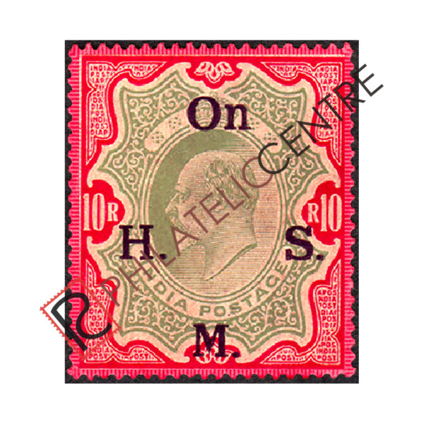 PCS51: BRITISH INDIA MINT STAMP: 1909 HIGH VALUES OF EDWARD OPT.WITH LARGER”ON H.M.S.” 10R GREEN & CARMINE