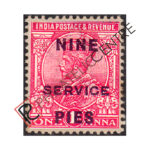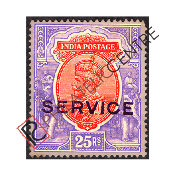 PCS66: BRITISH INDIA MINT STAMP: 1912-1913 GEORGE V SINGLE STAR WMK OPTD.”SERVICE”14MM ON LOWER VALUES & 21MM ON #145/153 RUPEE VALUES. 25R ORANGE & BLUE (1913)