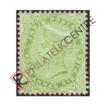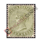 PC107A: BRITISH INDIA MINT STAMP: 1882 JANUARY 01-1890 QUEEN VICTORIA. WMK LARGE SINGLE STAR. 4A OLIVE GREEN