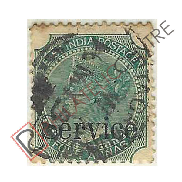 BRITISH INDIA USED STAMP: BRITISH INDIA OFFICIALS : 1867-1873 OVERPRINTED”SERVICE”. IN LARGER LETTERS.WMK ELEPHANT HEAD . 4A GREEN (DIE I)