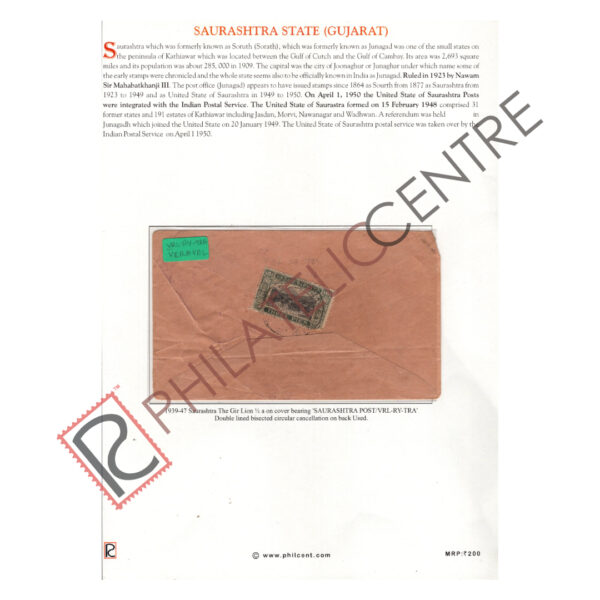 1939-1947 Saurashtra The Gir Lion 3p on cover bearing “SAURASHTRA POST/VRL -RY-TRA” Double lined bisected circular cancellation on back Used.