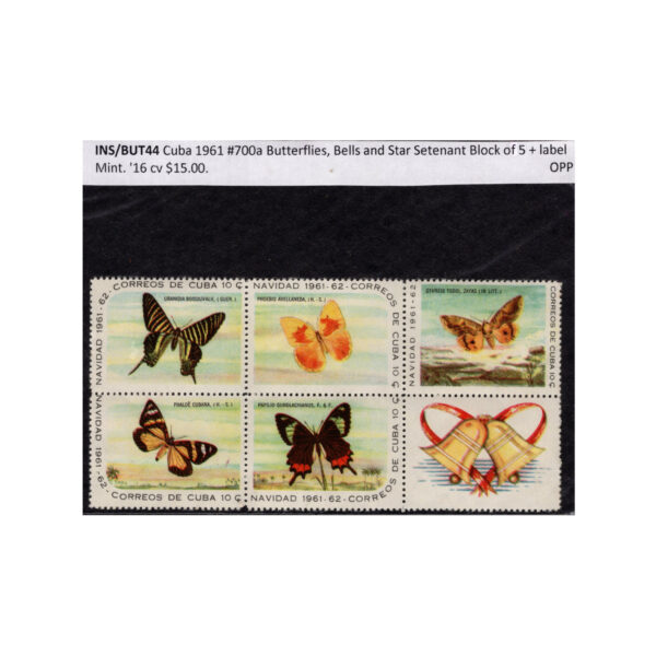 INS/BUT44 Cuba 1961 #700a Butterflies, Bells and Star Setenant Block of 5 + label Mint. ’16 cv $15.00.
