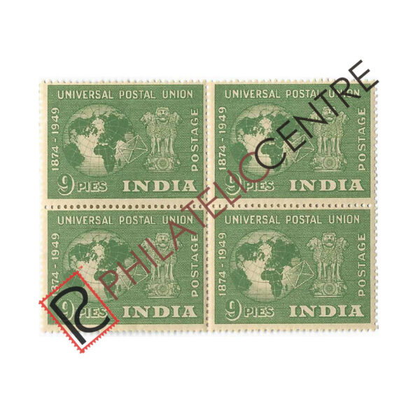 INDIA MINT BLOCK OF FOUR: 1949 OCTOBER 10 75TH ANNIVERSARY OF UNIVERSAL POSTAL UNION. 9P GLOBE, ENV. ETC