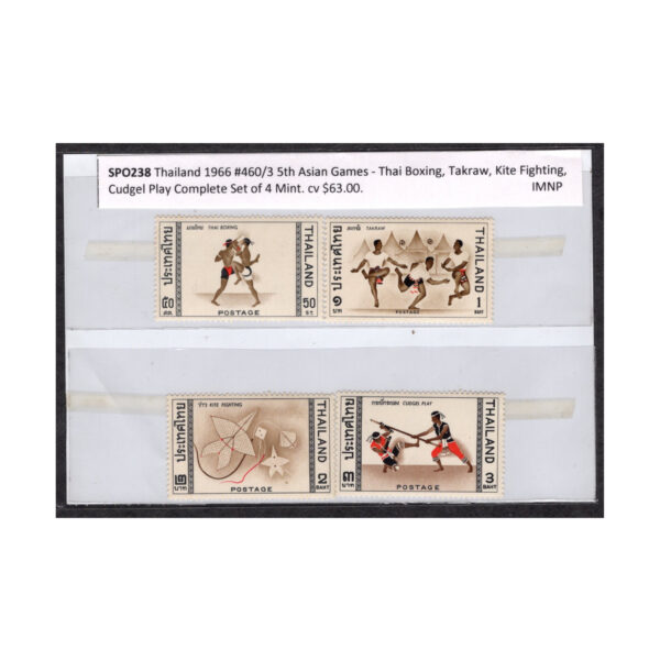 SPO238 Thailand 1966 #460/3 5th Asian Games – Thai Boxing, Tarawa, Kite Fighting, Cudgel Play complete Set Complete Set of 4 Mint. Cv $63.00.