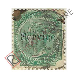 BRITISH INDIA USED STAMP: BRITISH INDIA OFFICIALS : 1866 AUGUST 01-1872 SMALL SERVICE OVPT. ON 1856-1864 EAST INDIA. WMK. ELEPHANT HEAD. 4A GREEN(DIE I) ON #81