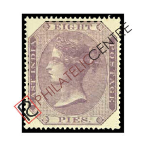 PC69: BRITISH INDIA MINT STAMP: 1865 PAPER WHITE TO YELLOWISH. WMK ELEPHANT HEAD. 8P PURPLE