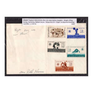SPO237 Thailand 1966 #445/8, #461 5th Asian Games, Bangkok - Weight Lighting, Boxing, Swimming, Netball, Soccer, Tarawa Set of 4 + Single on Depicted Greetings Card Mint. $39.50.