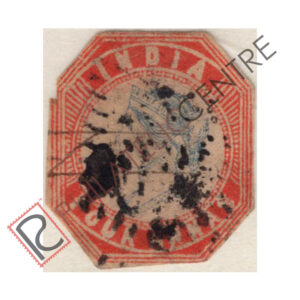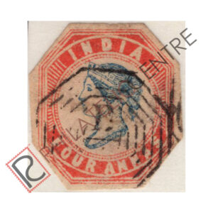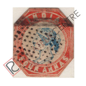 BRITISH INDIA USED STAMP: LITHOGRAPHED FOUR ANNAS: 1854 OCTOBER 15-1855. CENTRAL PORTION OF WMK. COVERING ENTIRE SHEET. IMPERF. 4TH PRINTING (1855 OCTOBER 04- NOVEMBER 03) HEAD III, FRAME II. STAMPS CLOSELY SPACED 2 TO 2 1/2 MM WITHOUT BLUE WAVY SEPARATING LINES. QTY: 5,40,960. 4A DEEP BLUE & RED