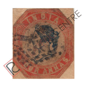 BRITISH INDIA USED STAMP: LITHOGRAPHED FOUR ANNAS: 1854 OCTOBER 15-1855. CENTRAL PORTION OF WMK. COVERING ENTIRE SHEET. IMPERF. 4TH PRINTING (1855 OCTOBER 04- NOVEMBER 03) HEAD III, FRAME II. STAMPS CLOSELY SPACED 2 TO 2 1/2 MM WITHOUT BLUE WAVY SEPARATING LINES. QTY: 5,40,960. 4A PALE BLUE & PALE RED