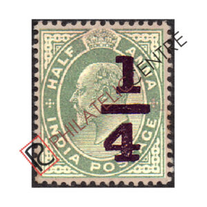 BRITISH INDIA MINT STAMP: KING EDWARD VII : 1905 FEBRUARY 02 DUE TO SHORTAGE OF 3 PIES STAMP,THE 1/2A VALUE WAS SURCHARGED"1/4". 1/4 ON 1/2A GREEN